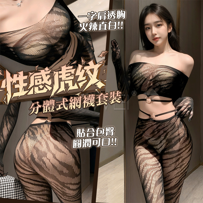 野性美學.性感虎紋一字肩環飾透胸分體式露腰網襪套裝【一字肩網衣+連褲襪】