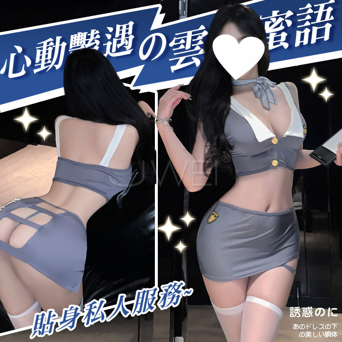 雲端蜜語.深V露溝裙襬鏤空包臀慾情空姐套裝【上衣+短裙+絲巾+T褲】