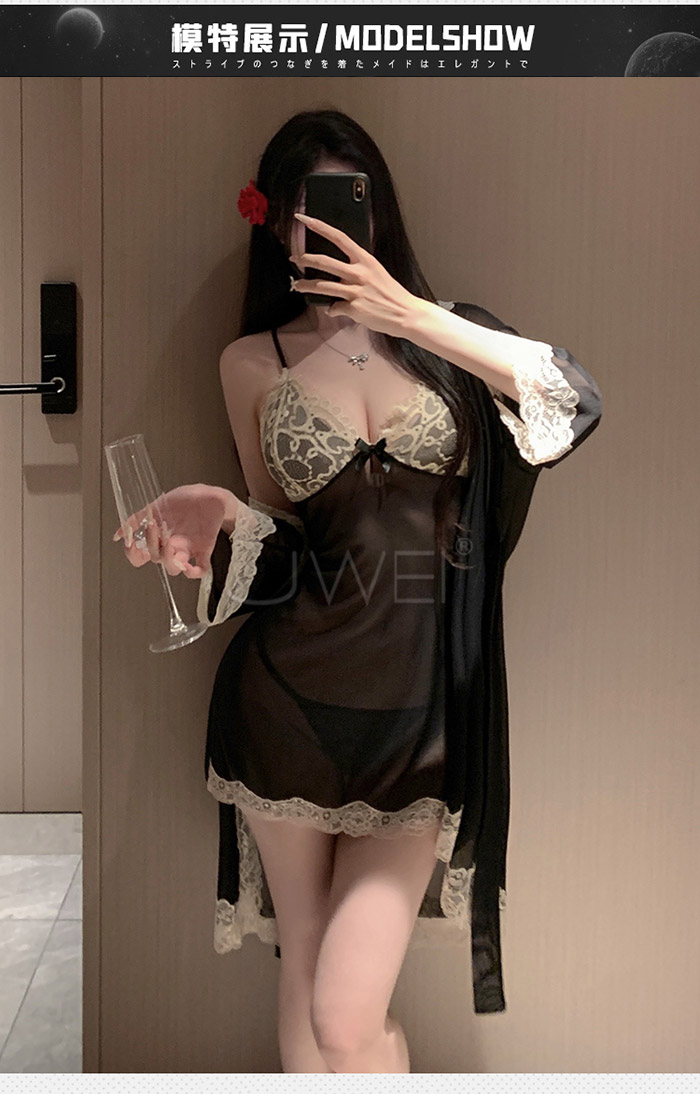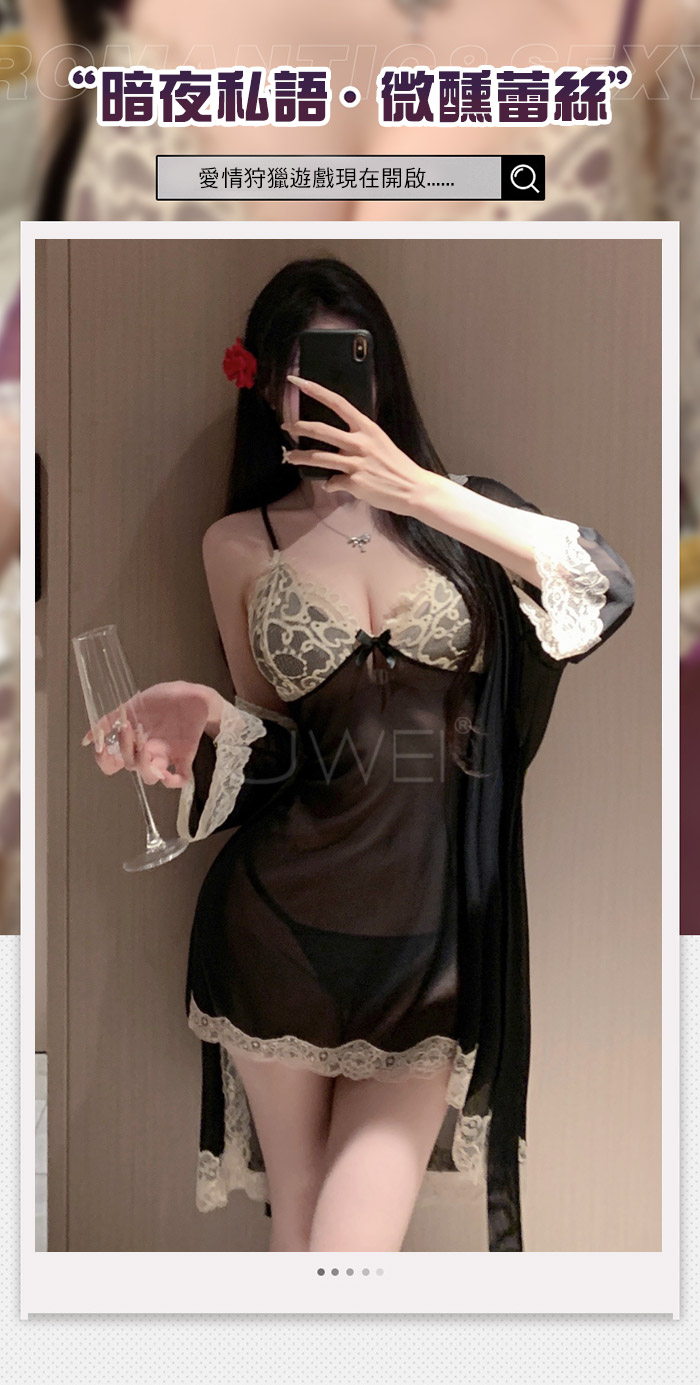 | 微醺蕾絲.性感深V露溝睫毛蕾絲覆胸美背睡裙-黑色【外袍+睡裙+T褲】