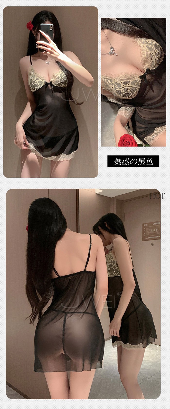 ►您現在的位置:首頁>微醺蕾絲.性感深V露溝睫毛蕾絲覆胸美背睡裙-黑色【外袍+睡裙+T褲】