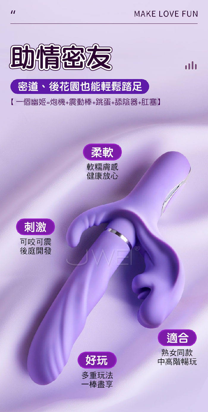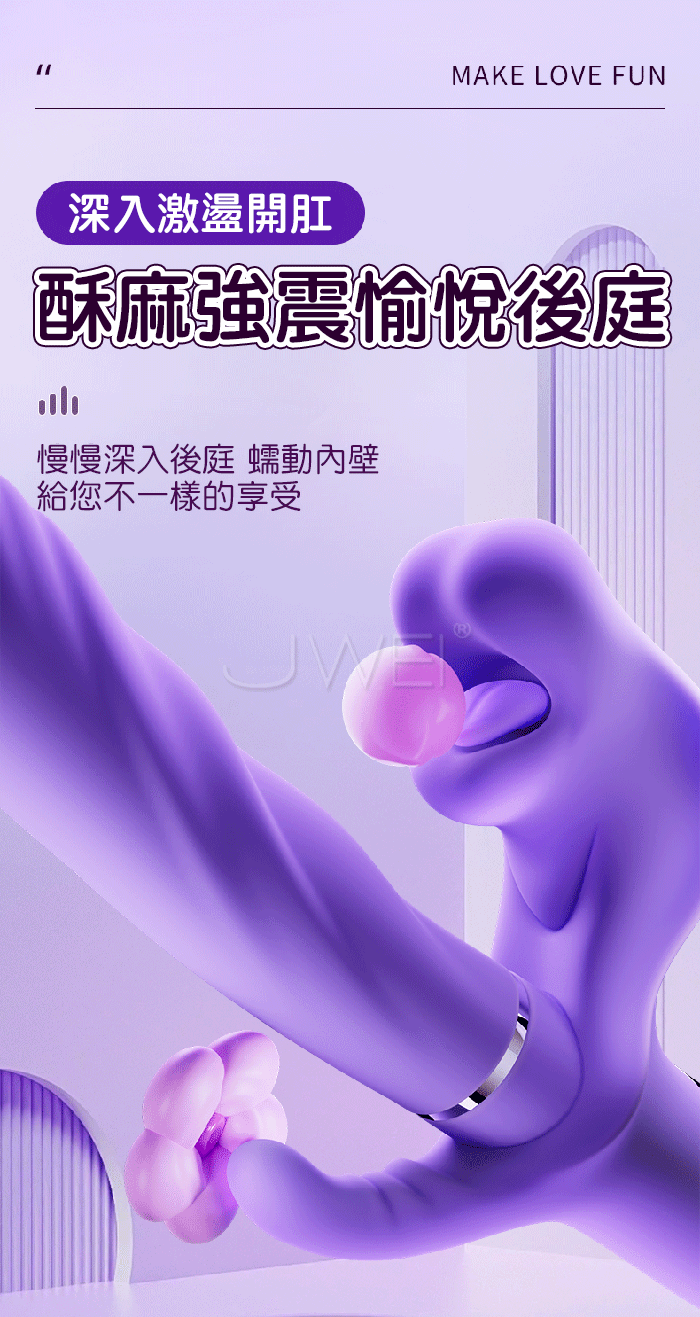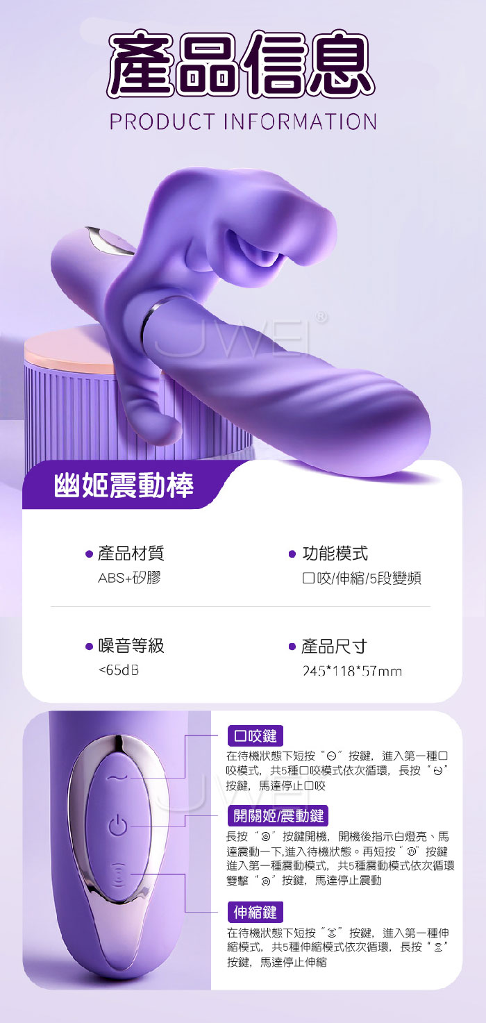 咬舐·伸縮·後庭探秘,享受激情混合爽,告别單一刺激 多方位點燃慾望 5頻包裹纏綿啃咬,口愛與軟舌雙重纏綿強烈動感,大幅度舌擺勝於男友口愛 5頻伸縮打樁機伸縮撞擊,下面整個酥麻,一進一出高潮就來了 深入激盪開肛,酥麻強震愉悅後庭,慢慢深入後庭蠕動內壁,給您不一樣的享受 產品規格 ■材質: ABS+矽膠 ■規格: 詳如圖片標示 ■特色: 5頻震動、5頻伸縮、5頻咬合