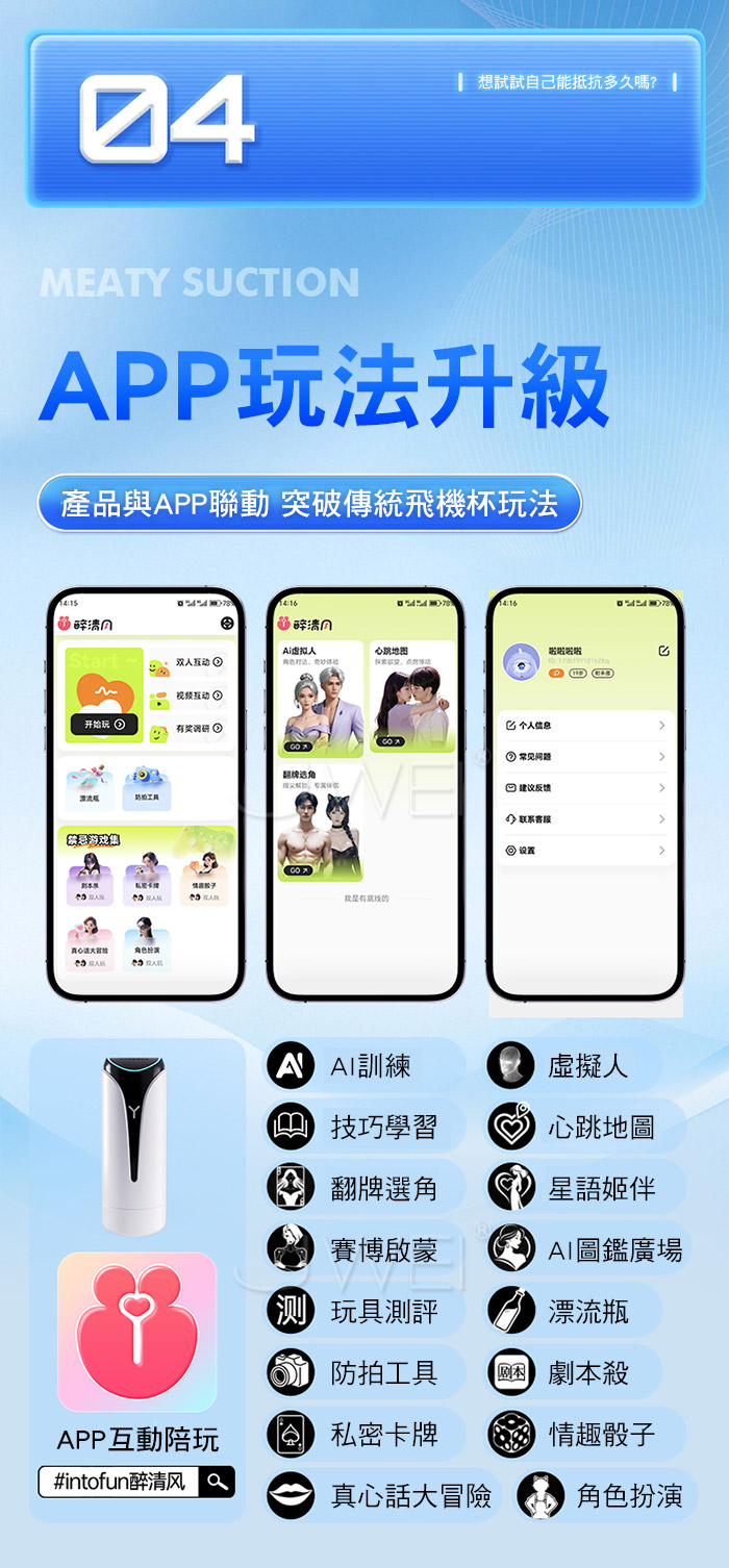 擬真肉感通道,Q彈軟糯,9種模式酥麻震顫 模擬真實通道律動 1指操控 吮吸控制,通過按住前端Y字形出風口 隨著抽插,控制內部氣壓狀態,從緊緻密道,到酣暢淋漓 戰鬥力訓練,層層顆粒刺激,每次多堅持一分鐘,挑戰自我 時尚外觀,流線杯身簡約設計,全新的視覺體驗!! 產品規格 ■尺寸:大小詳如圖片標示 ■材質:TPE+ABS ■特點:9頻震動、Y型氣孔負壓吮吸、APP智控