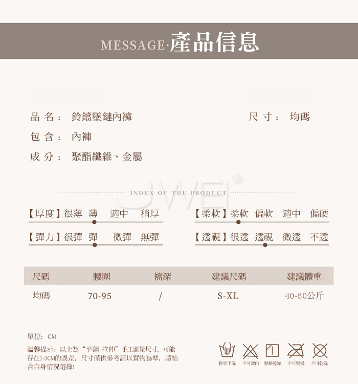 ■內容物:內褲*1 ■適穿尺寸:FREESIZE ■彈性:彈 ■未撐開平量尺寸正負誤差1~2cm,1吋=2.54cm ■注意事項:基於保障消費者個人衛生,此貼身衣物恕不接受退換貨。 (如為商品本身暇疵,接受七日內換貨,請勿試穿,謝謝您)